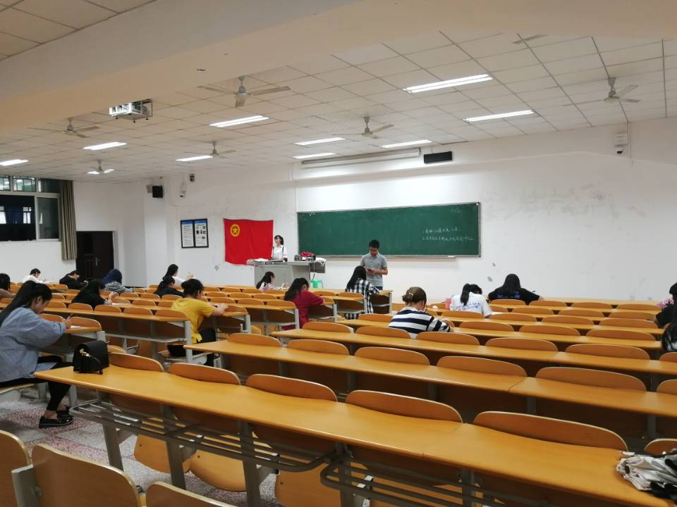 考试开始之前监考人员认真诵读考场纪律,耐心询问考生是否有其他需求,极大的缓解了考场紧张的气氛。本次入党积极分子测试的考试范围为:第十九次全国人民代表大会、中国共产党章程、党史、基础党建知识。题目难度较大,其中包含一道必对题目,必须答对此题才能获得进行卷面成绩统计的机会。在本次考试中,每位同学都认真对待,时而眉头紧锁,时而会心一笑,由此可见他们对本次测试的重视。同样,现场巡考人员亦专心致志,维持着考场秩序的同时,也使得考试变得更加规范。