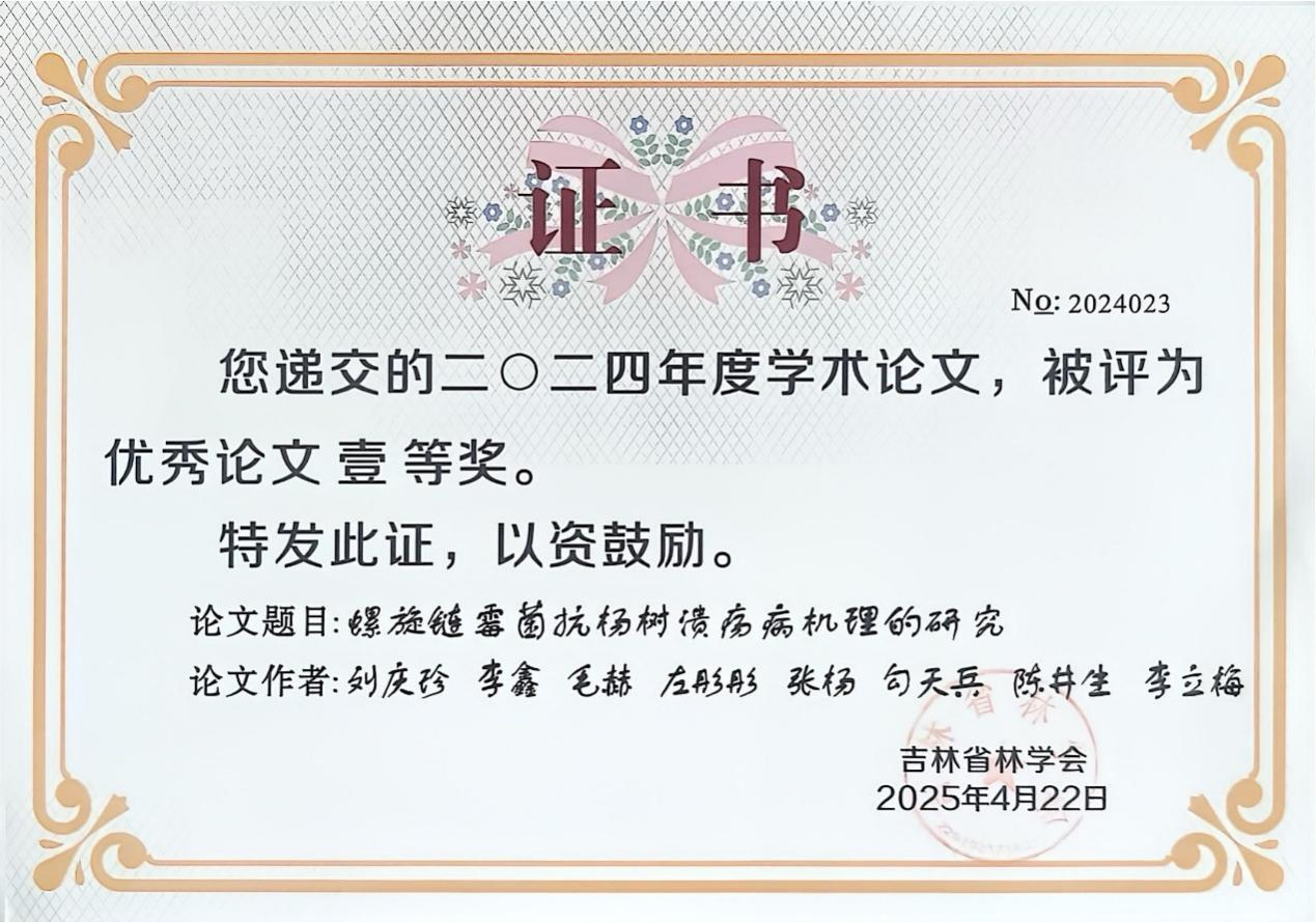 近日,吉林省林学会公布了2024年度优秀论文评选结果,公司陈井生博士作为通讯作者发表的论文《The antagonistic activity ofStreptomyces spiroverticillatus(No. HS1)against of poplar canker pathogenBotryosphaeria dothidea(螺旋链霉菌抗杨树溃疡病的机理研究)》获优秀论文一等奖。
