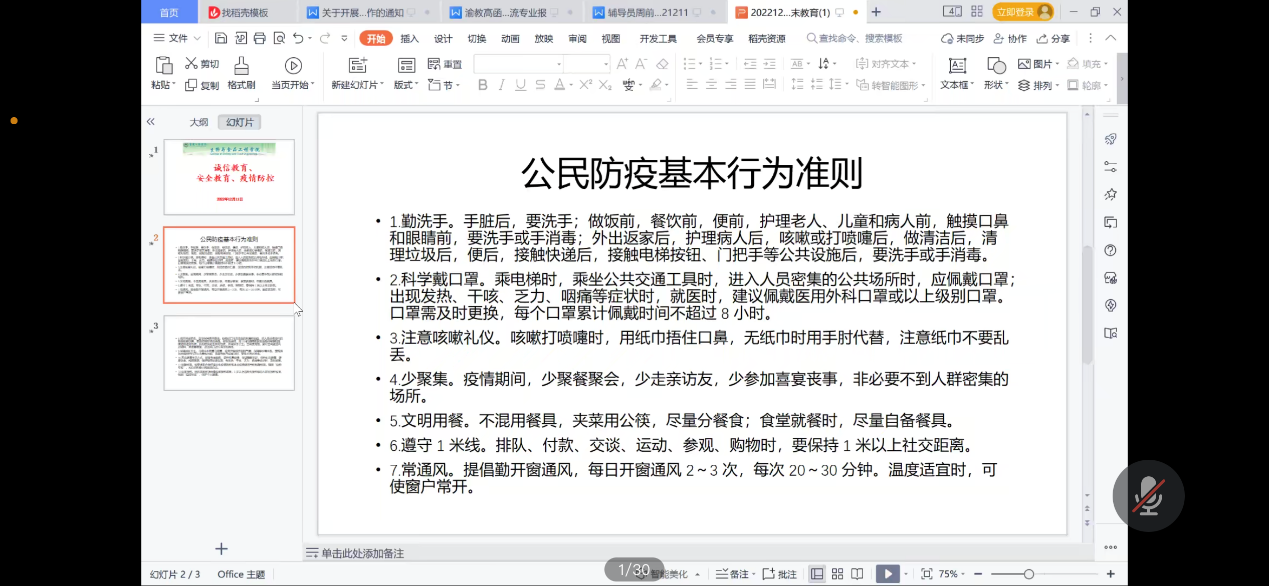 会上,辅导员带领大家深入学习贯彻习近平总书记在江泽民同志追悼大会上所致悼词精神,教育引导广大青少年坚定不移听党话、跟党走。同时持续做好安全教育,开展文明观赛、不参加任何形式的赌球活动;谨防电信诈骗、防网贷,努力提高安全意识,增强自我防范能力。接着,就线上考试问题,提出诚信考试要求,不作弊,不搞“小动作”,以正确的态度面对考试。最后提醒大家做好疫情防护,勤洗手,勤通风,正确科学佩戴口罩,做好自我清洁,疫苗做到“应接尽接”,一起学习《公民防疫基本行为准则》,当好个人健康“第一责任人”,安全返乡。