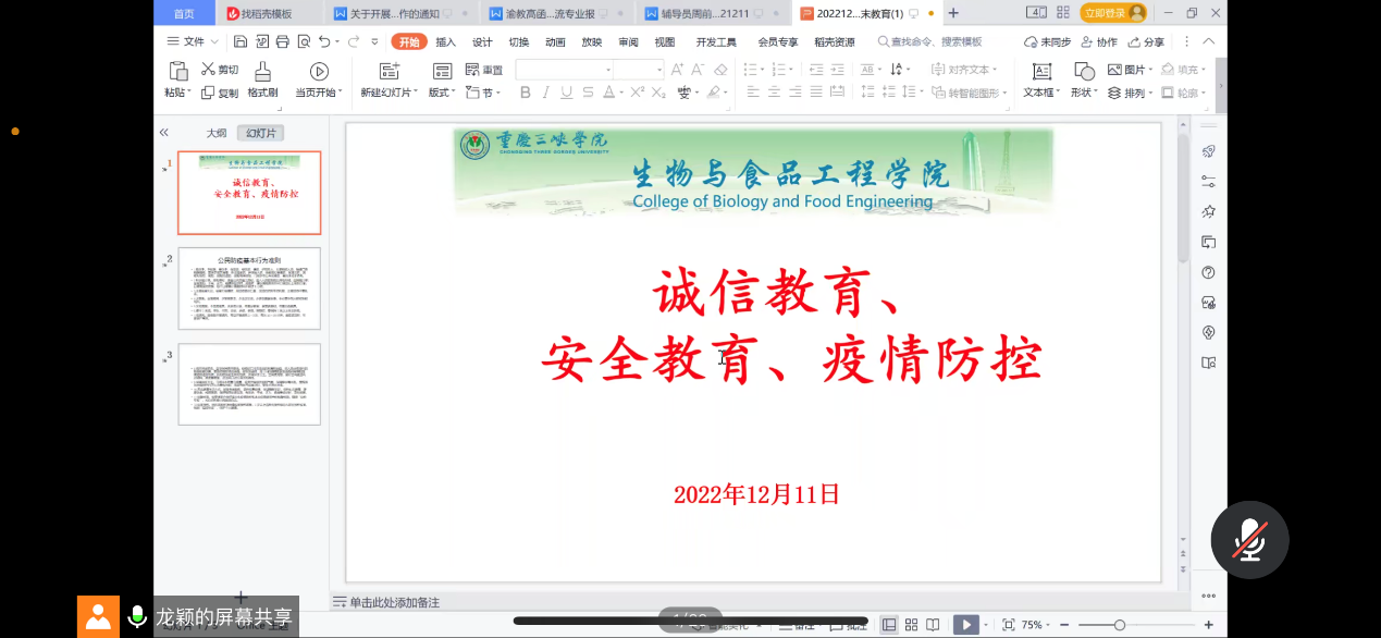 12月11日下午,公司辅导员熊小飞、许美琳、龙颖、龚莉分年级开展线上诚信教育、安全教育、疫情防控专题周末教育,公司全体员工参加。
