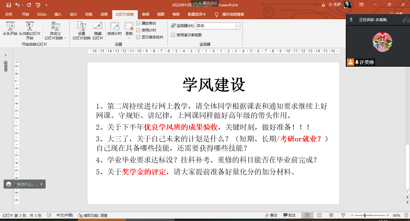 会上,辅导员从疫情防控、学风建设两方面出发,首先提出近期疫情防控要求,继续做好线上教学,在网课期间严格按照公司管控要求,做好自身防护。同时叮嘱同学们做好奖学金评定的材料准备,积极建设优良学风班。最后希望同学们要制定好长期和短期目标,规划学习方向。