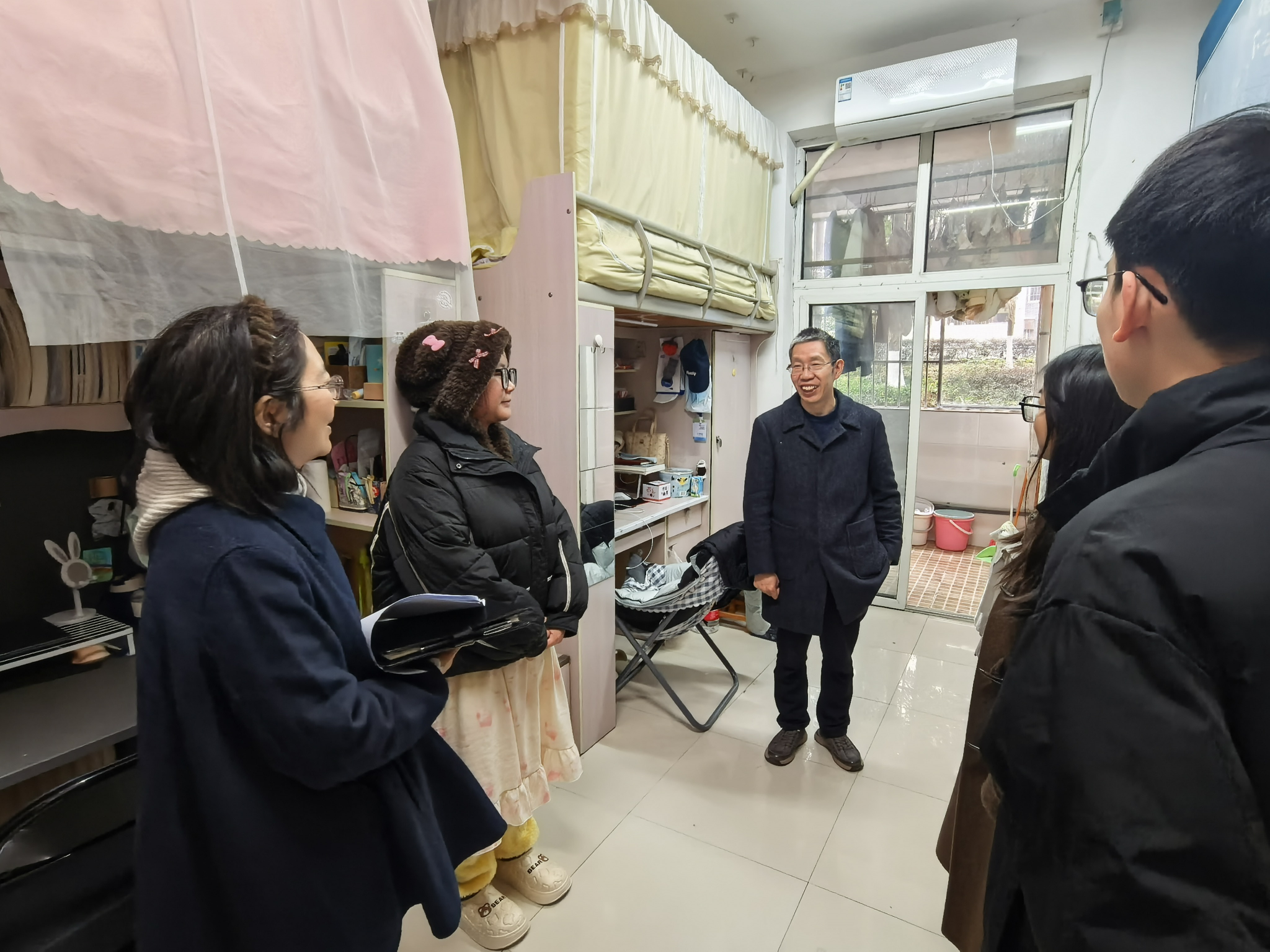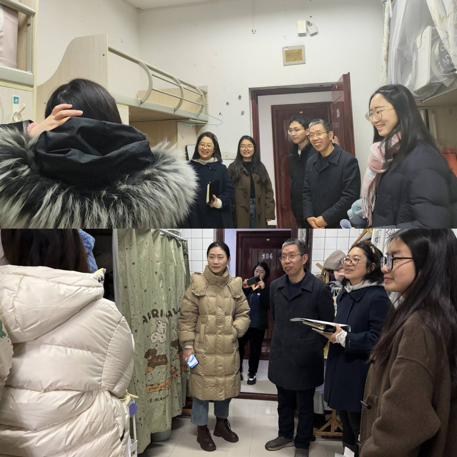走访过程中,肖国生书记与同学们亲切交流,细致询问大家近期的学习安排、期末备考状态及假期规划,并鼓励同学们科学规划复习时间,做到劳逸结合,以饱满的精神状态迎接考试。黎涵副书记在交流中特别强调了考风考纪的重要性,指出期末考试既是学业成果的汇报,更是诚信品格的检验,希望同学们自觉遵守考试纪律,维护公平公正的考试环境。全体学工人员还对宿舍消防安全、卫生环境等进行了仔细排查,叮嘱同学们牢固树立“安全第一”意识,严格遵守宿舍管理规定,养成“人走断电”的良好习惯,并提醒同学们在日常学习与生活中遇到困难及时向辅导员反映。