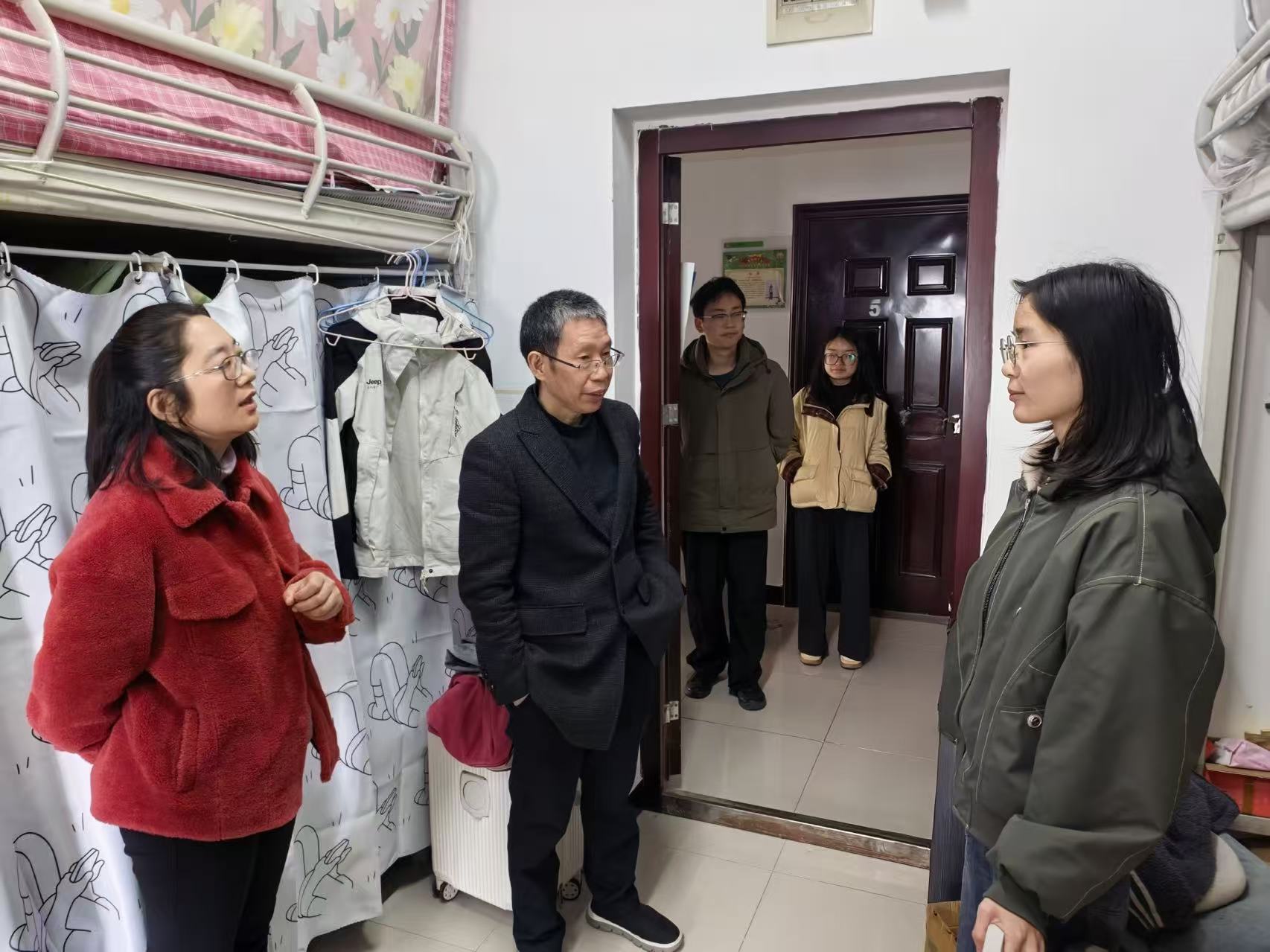 走访过程中,肖国生书记与同学们亲切交谈,细致询问寒假见闻、新学期课程安排、学习生活规划及个人发展需求,鼓励大家尽快调整状态,明确目标,以饱满的热情投入新学期的学习与成长。黎涵书记重点关心同学们的身心健康与集体生活,叮嘱大家互帮互助、团结友爱,遇到困难及时向公司反映,勉励大家珍惜时光、勤奋进取。全体辅导员在走访中叮嘱同学们注意宿舍用电安全,爱护消防设施,保持清洁卫生,并反复提醒大家增强安全意识,严格遵守宿舍管理规定,共同维护安全、文明、和谐的居住环境。同时,辅导员们也向同学们介绍了新学期各项支持服务的具体安排,确保沟通渠道畅通、帮扶机制有效。