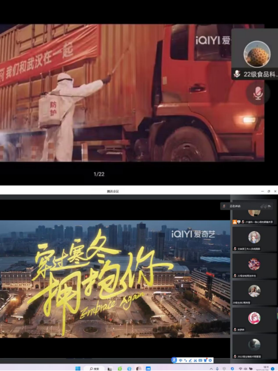 本次线上观影活动共有两场,第一场集中观看的影片是《中国医生》,该片讲述了在2020年疫情爆发时,中国的医生和医护人员们面对困难无所畏惧,面对疫情时展现出的愿意牺牲一切的大无畏精神。第二场集中观看的影片是《穿过寒冬拥抱你》,该片讲述了以武汉抗疫为背景,以温情和治愈为基调,刻画了普通市民守望相助,真挚动人的形象,使爱在武汉的烟火气下蔓延,抵御一切苦难,最终见证奇迹。观影期间,同学们被电影中医生的勇敢无畏和无私奉献深深地打动;感受到了恢复正常生活后武汉的万众欢腾和中华民族的人文精神。观影结束后,同学们对电影情节展开热烈讨论,大家纷纷上传观影的照片,畅谈观影的感受和感动。