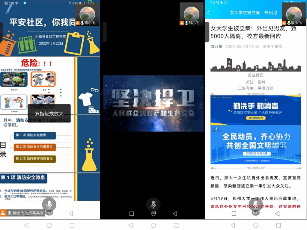 会上,各辅导员通过PPT和观看宣传片的形式,首先从员工寝室消防安全出发,着重进行了消防安全隐患、消防安全的重要性、如何做好消防安全三个方面的教育,引导同学们树立安全用电、防火防盗的安全意识。其次强调了防电信诈骗注意事项,提醒同学们高度重视,不掉入诈骗分子的陷阱。最后通过案例分享,提高同学们对疫情防控的重视度,叮嘱同学们严格遵守疫情防控政策与管理措施。