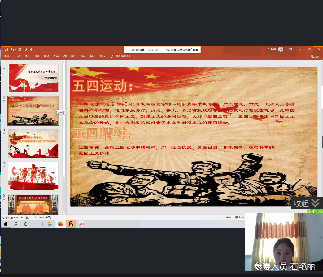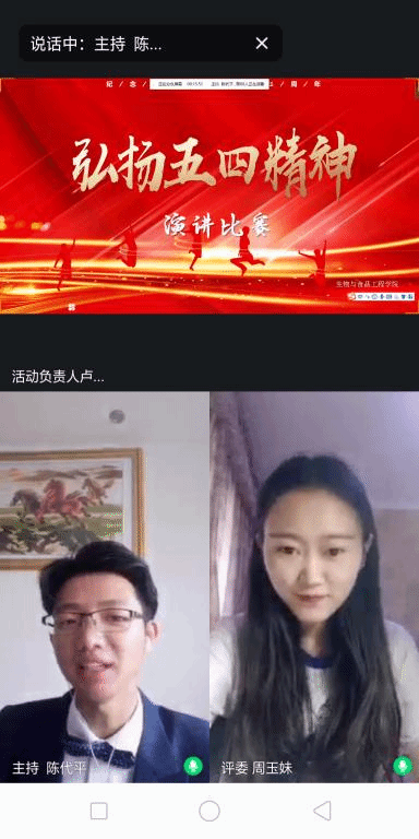 4月25日—4月29日,公司通过线上平台宣传本次比赛,号召同学们积极参与,并建立比赛咨询群,使同学们了解比赛规则及注意事项,要求在规定时间内将参与视频发送至工作人员,随后打包发送至评委,角逐出八位参赛选手进入本次活动决赛。5月4日9:30,决赛正式开始,由主持人陈代平喊出的口号“弘扬五四精神,发出青春之声”中拉开帷幕,八位参赛选手在演讲中回顾历史、抒发爱国情怀,将个人成长融入祖国发展、民族复兴中来,彰显了生工学子的朝气蓬勃和爱国热情。最后,由公司团总支学会生干部邹欣怡、雷承霖进行点评,针对选手们的表现,分享个人演讲心得与经验,随后主持人宣布活动结束,为本次演讲活动划上了完美的句号。