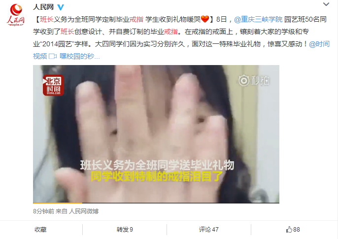 “当我们打开包装盒的刹那,眼泪都流出来了。”近日,一则“班长自费定制毕业专属戒指,全班同学收到礼物暖哭”的新闻备受关注,目前已被人民网、新华网、中国日报、新浪、重庆晚报、重庆晨报、扬子晚报、万州电视台等16家媒体转载。