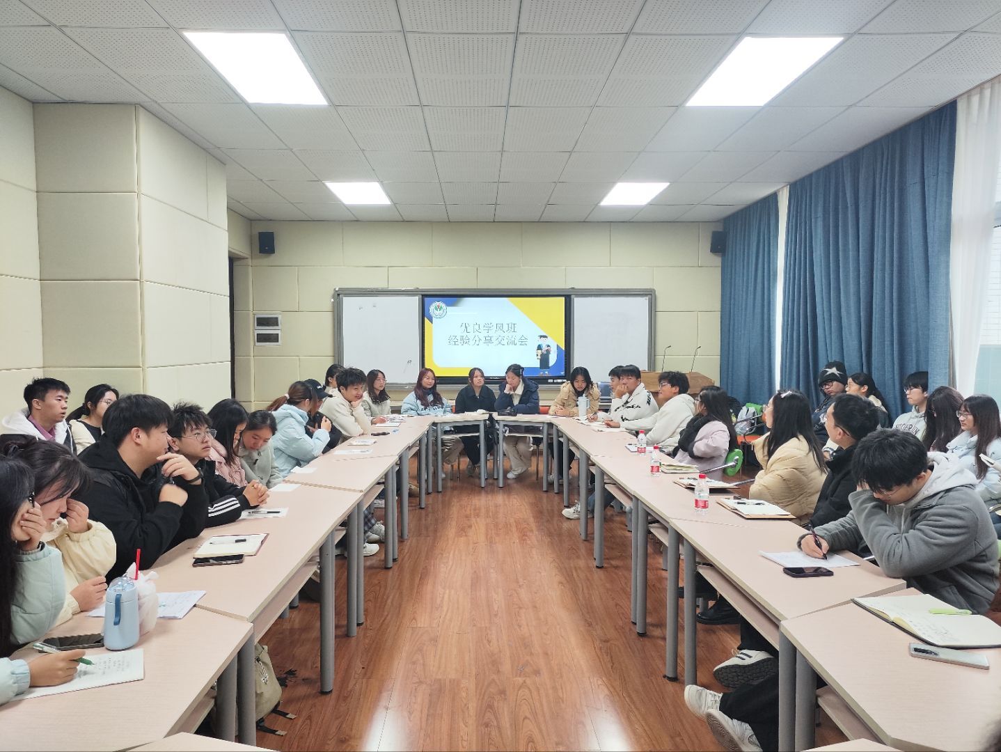 交流会上,两个优秀班级代表围绕班级制度建设展开分享,介绍了具有可操作性、易于推广的具体做法,为在场班级提供了切实可行的参考。在互动问答环节,2024级、2025级班委踊跃提问,就“如何调动同学积极性”等实际问题向学长学姐及在场老师请教。高年级员工结合自身经历给予具体建议,老师们则从管理育人的专业角度进行了深入分析与详细指导。