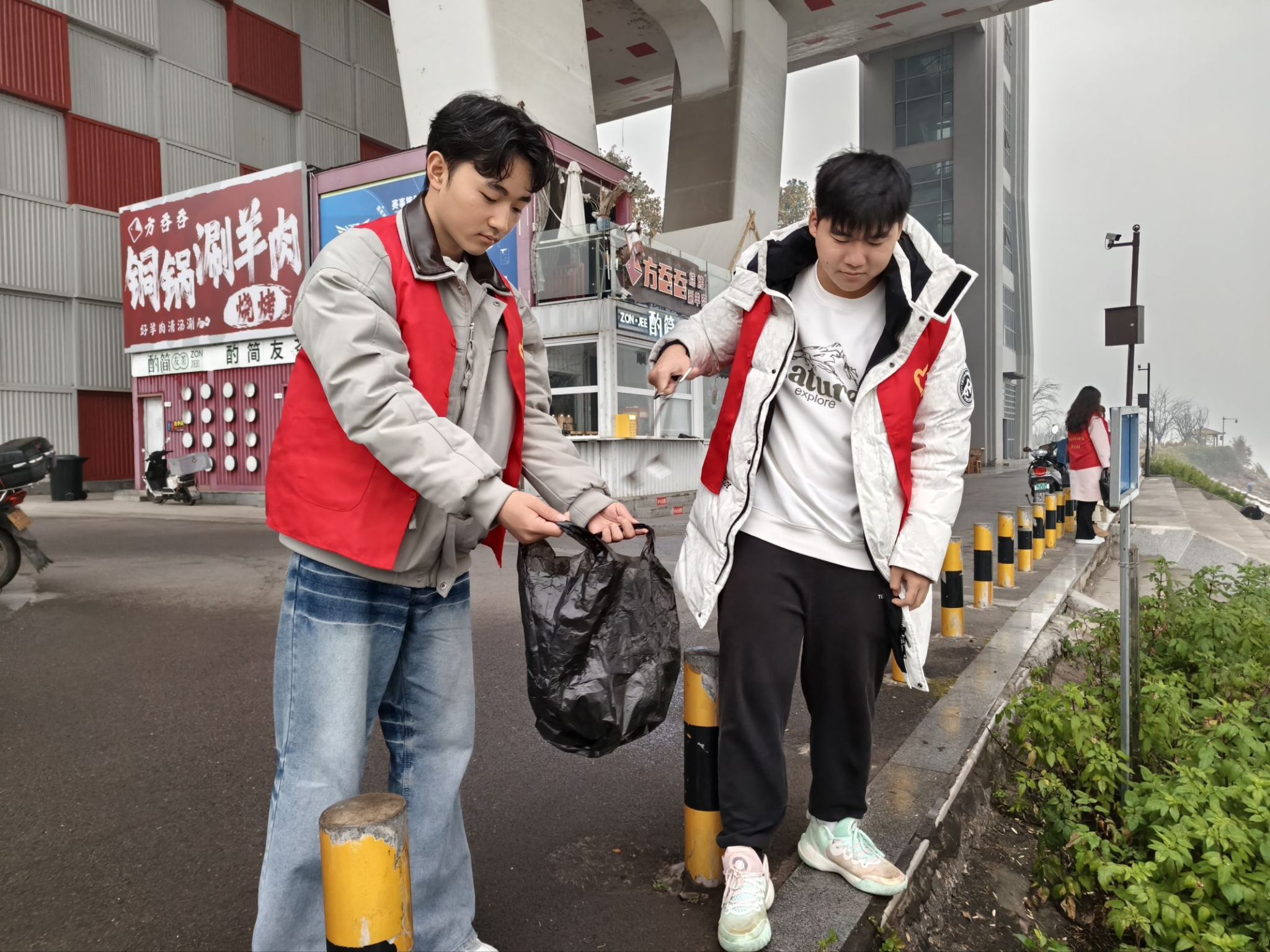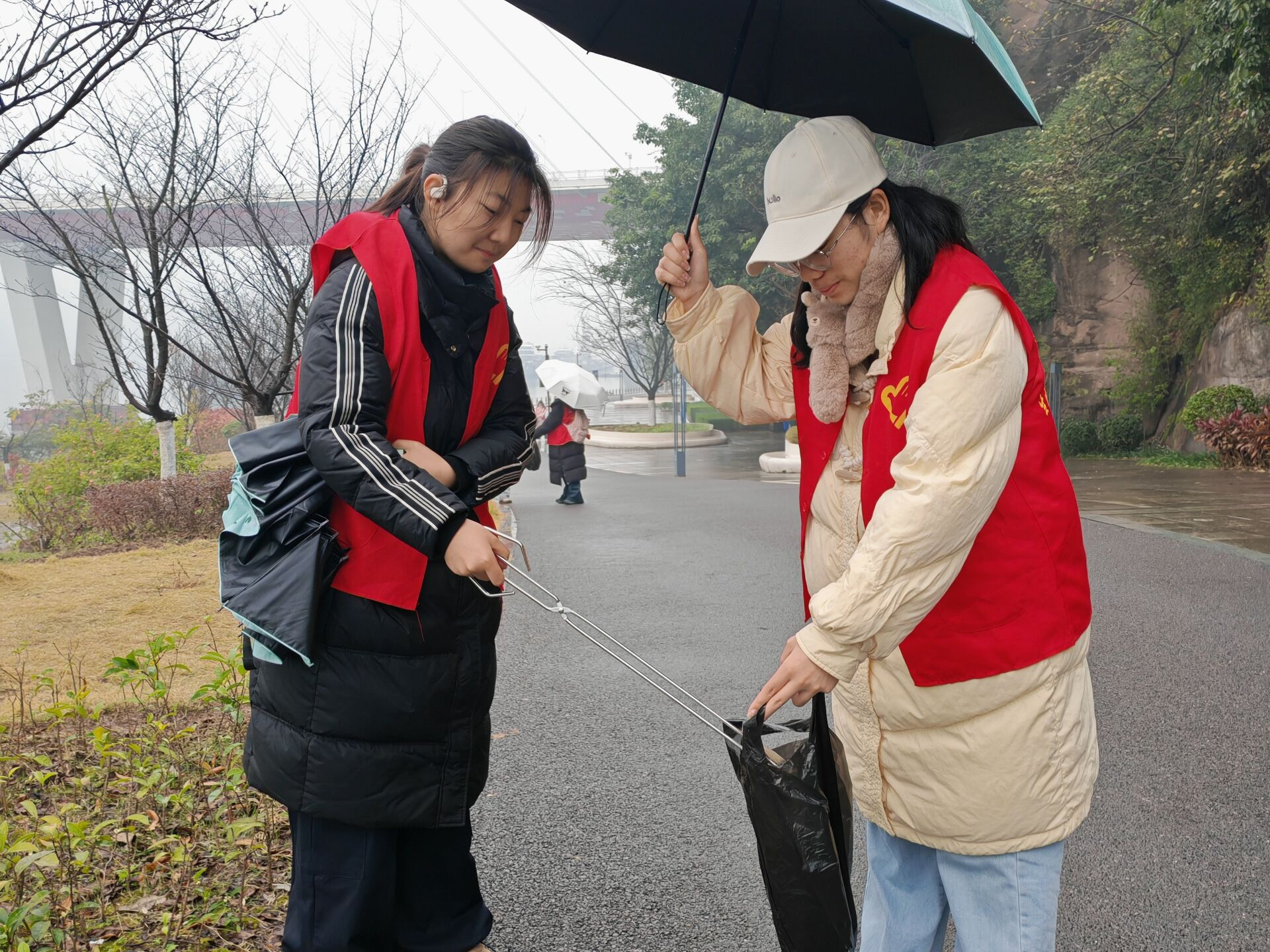 活动中,身着统一红色志愿服的志愿者们分工协作,手持钳子和垃圾袋,沿公园江岸开展清理工作。尽管活动当天细雨绵绵,志愿者们仍有序推进各项工作,重点清理了沿岸散落的烟蒂、塑料制品等垃圾,用实际行动兑现“守护母亲河”的承诺。