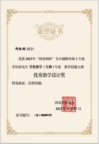 喜报:公司员工在全国“田家炳杯”全日制教育硕士学科教学(生物)专业教学技能大赛中斩获佳绩