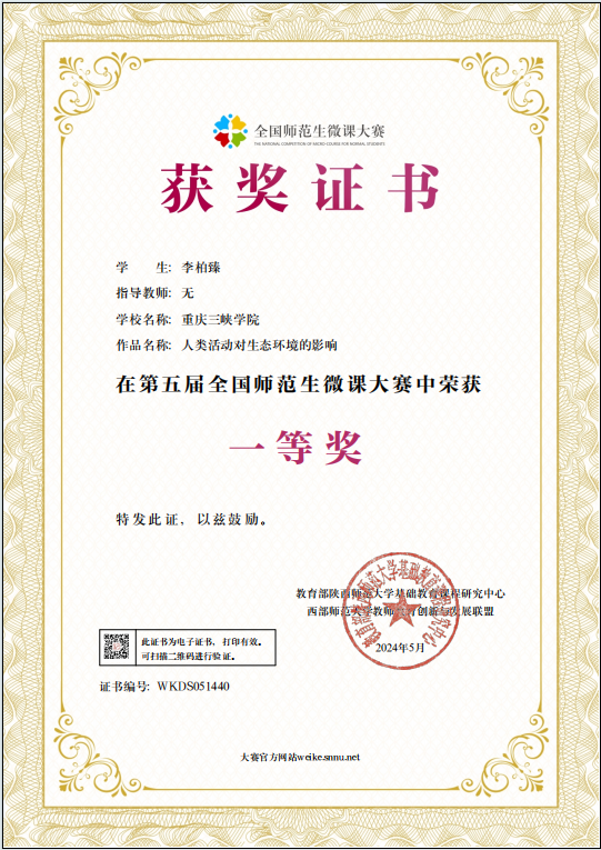近日,由陕西师范大学基础教育课程研究中心与西部师范大学教师教育创新与发展联盟共同组织的第五届全国师范生微课大赛终于落下帷幕。公司学子李柏臻的作品《人类活动对生态环境的影响》获得大赛一等奖。