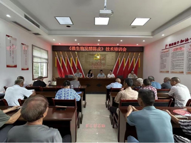 此次培训由公司党总支书记肖国生教授牵头,党支部书记赵峰、党员张华、顾欣,重庆三峡农业科公司陈泉、刘忠贤共同授课。内容聚焦微生物发酵陈皮技术、红桔褐斑病综合防控及高品质栽培管理。大周镇50余位种植户参加。